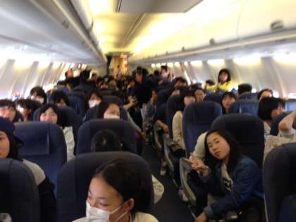 ANA763便の様子です。機内でお昼ご飯を食べ、まさに空弁!、空の旅を満喫している様子。無事着陸(昨日広島で着陸ミスがありました)。到着ゲートからコンコースに移動し、タクシーに分乗して平和学習が始まります。3時に集合する平和祈念資料館‐平和の礎‐まで各班が計画した、それぞれの「平和への道」をたどります。