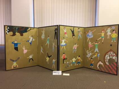 醍醐中学校1年生による「私たちの舞楽図屏風」。中総文に出展した3対の屏風は、6月に醍醐寺さんで鑑賞した俵屋宗達作舞楽図屏風にインスピレーションを受けクラスごとに作成したものです。琳派の趣が伝わってくる素敵な作品に支上がり「琳派400年記念特別企画展優秀賞」を受賞しました。