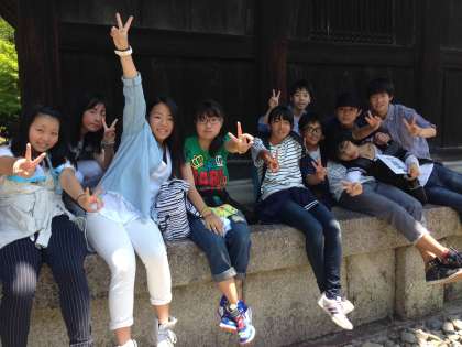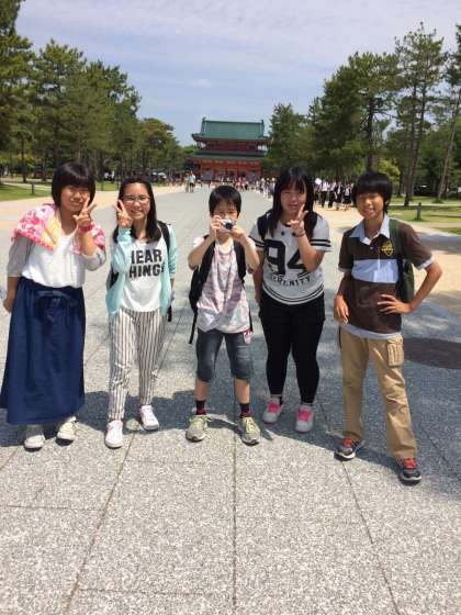 班別行動で平安神宮、南禅寺、府立図書館にやって来たグループです。京都市内は汗ばむくらいの陽気。はぐれることなく自分たちの決めたコースを回り、チェックポイントでチェックを受けます。この後、昼ご飯を食べる動物園に向かいます。