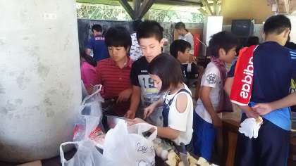 かまど作りと調理が始まりました。真剣な眼差しで火をおこします。調理の方も包丁を使うので真剣です。ところが、調理に集中しすぎたある班は、荷物をポイと置いておいたもので貴重な「肉」をいたずらカラスに持って行かれてしまったそうです。ごちそうカーカー。