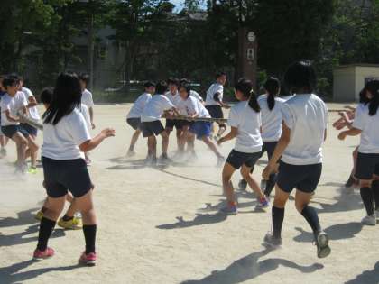 学年練習シリーズ最終回は2年生。種目は「棒引き」です。7本の棒を自陣まで持ち帰るのですが金の棒は3点、銀の棒は2点、普通の棒が1点。銀の棒、金の棒の引き合いになると人数が集まってきます。入場から本番さながらの熱戦が繰り広げられました。それにしてもすごい砂ぼこり!