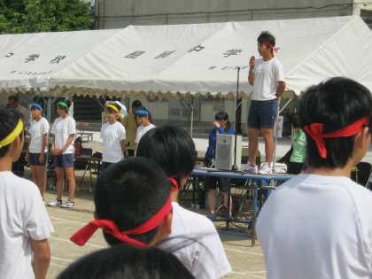 開会式です。校歌を歌って校旗を掲揚した後、学校長、健康委員長から挨拶があり、選手宣誓、準備体操へと進んでいきました。例年はラジオ体操でしたが今年は嵐サウンドに乗った健康委員会オリジナル体操です!