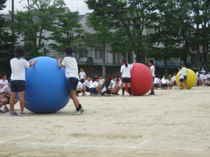 1年生による「大玉運び」です。練習の時より上手に大玉を転がしています。スタートでトップに立った黄色=1−3がそのまま逃げ切りか、と思われましたが青=1−1が大逆転です!最初の団体種目で早くも大声援が飛び交いました。