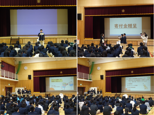 本日、体育館にてMDR活動による寄付金贈呈式が行われ、今年度のMDR活動の成果である寄付金を関西盲導犬協会へ贈呈することができました。また、2025年に醍醐中学校から同協会への寄付総額が600万円に達したことを記念する場ともなりました。