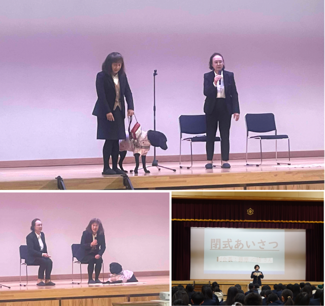 盲導犬を1頭育成するには約300万円が必要といわれており、本校はこれまでに盲導犬2頭分に相当する寄付を行ってきたことになります。式には、関西盲導犬協会の方と、盲導犬ユーザーさんにご参加いただき、お二方から大変貴重なお話をうかがうことができました。盲導犬ユーザーの方にとって、盲導犬の存在は実用的なサポートだけでなく、精神的な支えとしても非常に大きいことを教えていただきました。