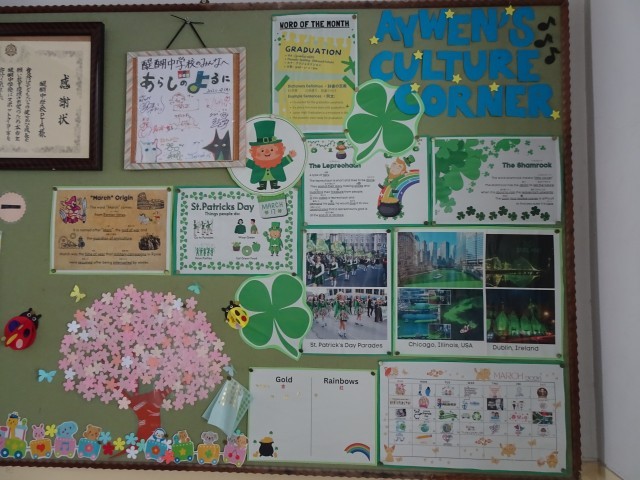 ALTに英語への関心を高め、海外の文化に親しむ機会をつくるためALTが「Aywen’s Culture Corner」を校内に設置してくれています。