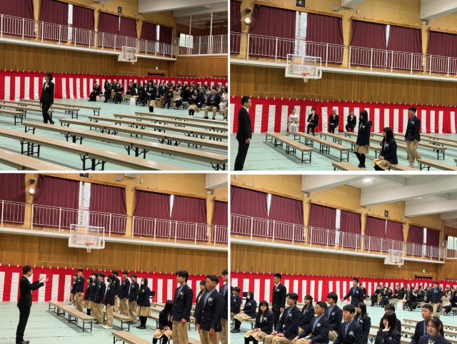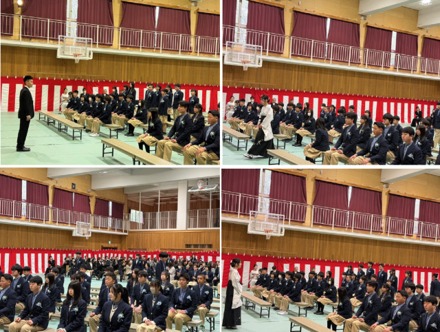 全員が着席すると、立派な緞帳がゆっくりと上がり、まるで卒業式の開式を告げるかのように厳かな空気が会場を包みました。静寂と期待が交差する中、令和7年度第78回醍醐中学校卒業式が厳かに開式しました。