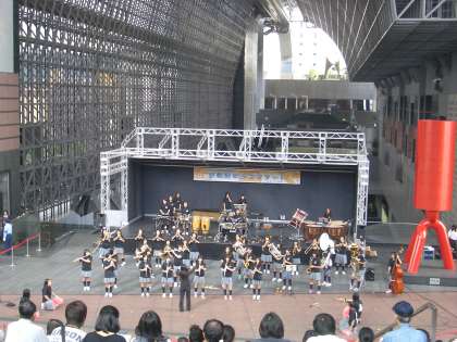 10月16日(土),京都駅ビルで「京都市中学校吹奏楽部 駅ビルコンサート」が行われ,本校吹奏楽部も出演しました。たくさんの聴衆の中,「宇宙戦艦ヤマト」と「学園天国」の2曲を,振り付けも入れて演奏しました。自然と手拍子も起こり,野外でのコンサートは盛り上がっていました。
