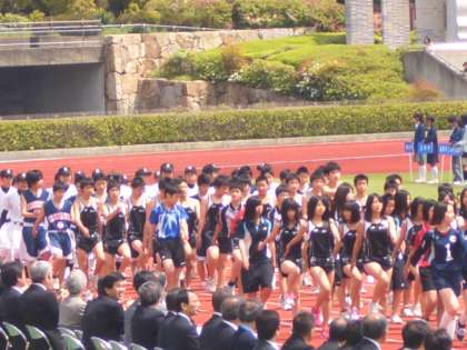 4月29日(金)に、西京極陸上競技場で春季総合体育大会の開会式が盛大に行われました。本校からも運動部から100名が参加しての、堂々の入場行進が行われました。昨年に引き続き、吹奏楽部も参加し全市にエールを送ってくれました。本校では、サッカー部の試合(大原野中にて)を皮切りに、各部活動ごとに全市の各会場で熱戦を繰り広げます。