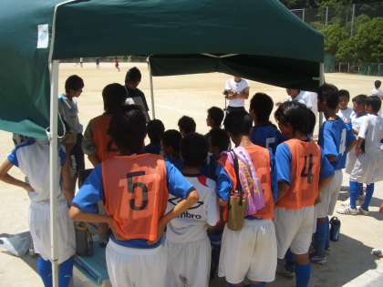 ギラギラした強い日差しが照りつける7月17日(日)の10時20分。大枝中学校を舞台に、対近衛中学校との1回戦が行われました。前半は2−0のリードで折り返し、集中力を切らさずに後半を迎えました。後半も2−0のスコアで、トータル4−0で見事勝利しました。(青いユニフォームが春日丘中学校サッカー部です。)