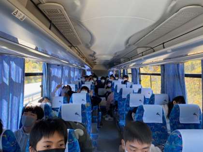 生徒たちはカードゲームをしたり、雑談をしたり、高山で遊ぶためのエネルギーをチャージしたり、、思い思いに過ごしています!中央道から見える山には所々紅葉が見られるようになってきました。