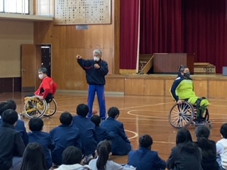 「京都アップス」というチームの選手2名と,元車いすバスケットボール日本代表コーチの方を講師に招いて,障がいについての学習を行いました。