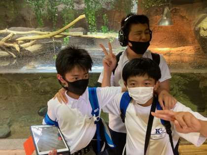 京都市動物園に到着しました。今日は気温がかなり高いので,外での活動はなかなか厳しそうです。涼しげな水槽の前でみんな楽しく鑑賞をしています。