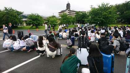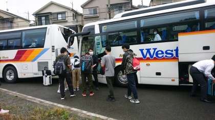 3年生全員集合を完了し,結団式を終え,なごみの里前を元気よく出発ているところです。