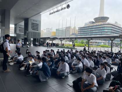 京都駅、京都劇場前に参加生徒は無事集合完了し、最終確認をして出発します。