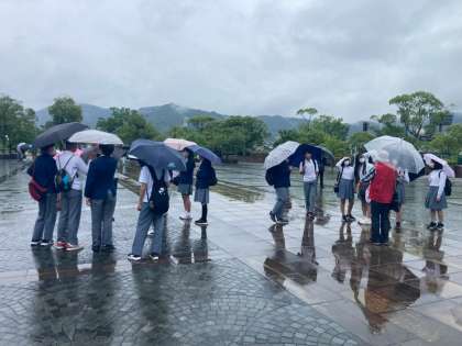 あいにくの雨ですが、さるくの方々のお話を聞きながら平和について学んでいます。