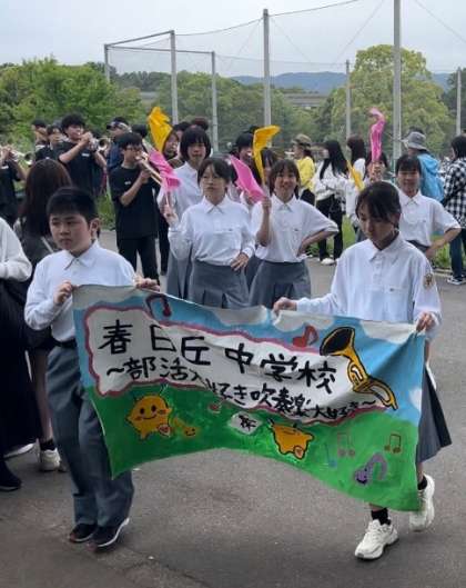 天候が心配されましたが、春日丘中単独パレードや京都府吹奏楽連盟合同バンドでの演奏、参加者全員での演奏にそれぞれ参加し、有意義な体験をしてくれました。今後の演奏活動に、この経験を生かして頑張ってほしいと思います。