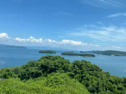 昼食を終え、ほほ時間通りの行程で進んでいます。バスは間もなくペーロン体験の会場である琴海に到着予定です。晴天の下、きれいな海が広がっています。