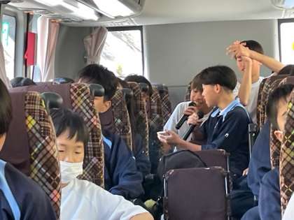 ペーロン会場までの間レクレーション係が企画してくれたバス内レクレーションで盛り上がっています。笑いあり、歌あり、あっという間に時間が過ぎ、海が近くに見えてきました。
