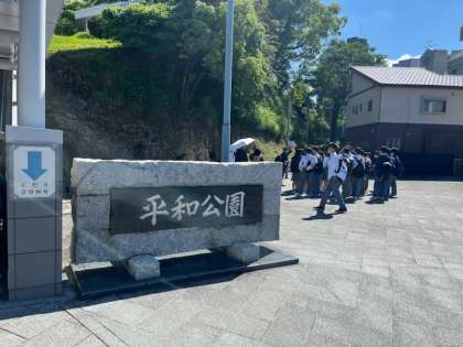 資料館の見学を終え、平和記念公園へ向かっています。平和記念公園では学年全体でセレモニーを実施します。本日も本当に良い天気です!