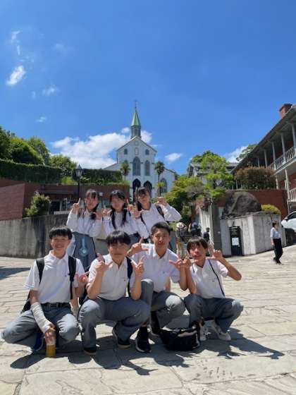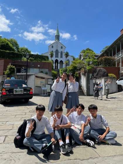 平和学習を終え、長崎市内の班別研修を開始しました。テキパキとした行動のおかげで予定より早く班別研修を始めることができています!班ごとにいくつかのチェックポイントを通過しながら市内を回ります。大浦天主堂のチェックポイントの様子です!