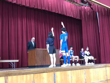 全校生徒が集まり春体激励会を実施しました。吹奏楽部の演奏のもと、各部のキャプテンが春季大会に向けての決意表明を力強く述べてくれました。2・3年生は秋の大会以降、長い間継続して蓄えた力を思う存分発揮してください。頑張れ春日丘中学校!!