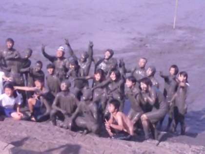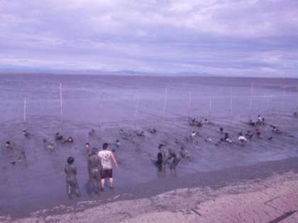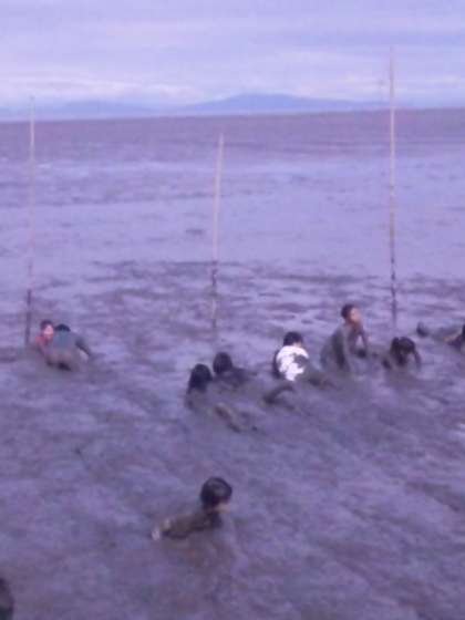 潟の上を泳いで競争する男女の個人競争です。先生方も一緒に参加します!!心は童心に戻りました。