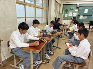 2年生が1年生に対しこの夏のチャレンジ体験を通して働くことの意味や今後の考えなどを端末を使いながらプレゼンテーションを行います。2年生が長い時間をかけて工夫を凝らし、聞き手を惹きつけるように発表しています。また1年生は来年度のチャレンジ体験に向けて、これからの自身の人生について非常に参考になる内容ではないでしょうか。今日のこの発表が最終ゴールではありません。今日の気づきを引き続き総合的な学習の時間を使って探求していきましょう。