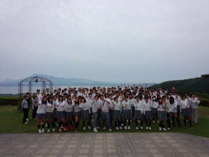 ホテルの前の素晴らしい景色です。この素晴らしいロケーションの中で写真が撮れるので、本当にいい記念になります。第27期生の集合写真です(平和の鐘が写っています・・・)。
