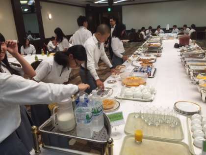 天気は曇りですが,全員元気に朝食を食べています。