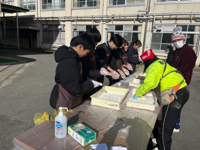 1月25日(日)、春日野小学校において、地域の少年補導委員会の皆様が主催される「もちつき大会」が開催されました。当日は、本校陸上部の有志生徒が参加し、ボランティアとして活動しました。生徒たちは、地域の大人の皆様と協力しながら準備や運営を手伝うとともに、参加していた小学生の後輩たちとふれあい、温かいおもてなしの心をもって接する姿が見られました。今回の活動を通して、生徒たちは地域の方々との交流を深め、地域貢献の大切さや、伝統行事に携わる意義を実感する貴重な経験を得ることができました。今後も、このような地域とのつながりを大切にしながら活動を続けてまいります。これからも、地域の皆様のご理解とご協力をよろしくお願いいたします。