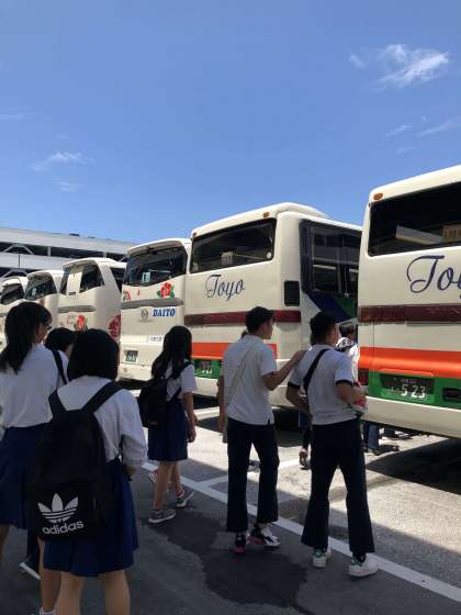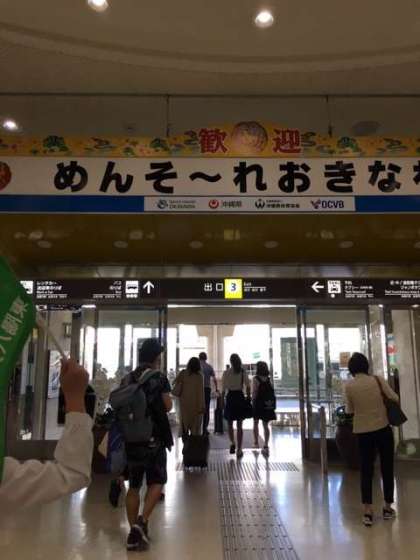 那覇空港にほぼ予定通り到着しました。空港で預けた荷物を受け取り,県立平和記念資料館に向けて出発です。沖縄の天気は快晴です。