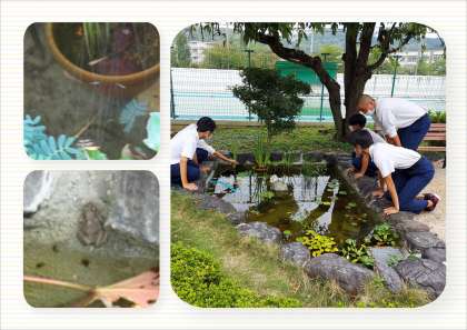 昼休みに盛況になってきている池の周りに,10分休憩の時間にもカエルの噂を聞きつけたくさんの生徒が興味深く見入ってくれていました。生まれたメダカの稚魚もスクスク育っています。あまりに見入っていて,授業のスタートに影響が出ませんように・・・