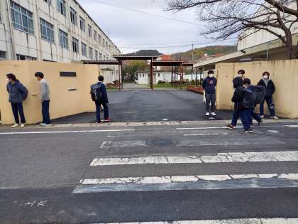 今朝,いつものように校門に出てみると,元生徒会本部役員を中心に自主的な「あいさつ運動」が行われていました。