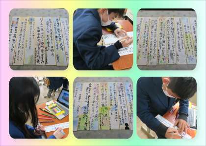 国語の授業で,三大和歌集の中から好きな和歌を一首選び,行書で作品を制作しました。和歌の意味を調べ,そこからイメージしたものを絵に表現していました。