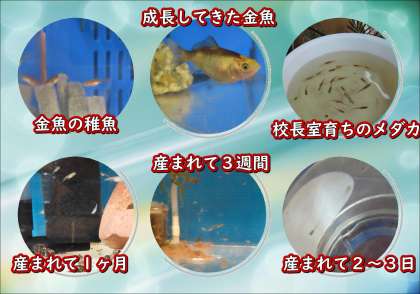 小栗栖池では多くのメダカが孵化し、順調に育っています。とはいえそのまま池に居ると多くの外敵から狙われるため、校長室で大きくなるまで育てています。