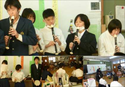 各校とも、この日に向けて準備してきた成果を十分に発揮することができました。中学校からの出し物は、アルトリコーダーによるメリーさんのひつじの演奏でした。小学生にはタンバリンでリズムをとってもらい、一体感のある時間となりました。