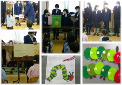 司会の言葉で交流が始まった後、家庭科の時間にフェルトで作ったはらぺこあおむしの玩具をプレゼントしました。