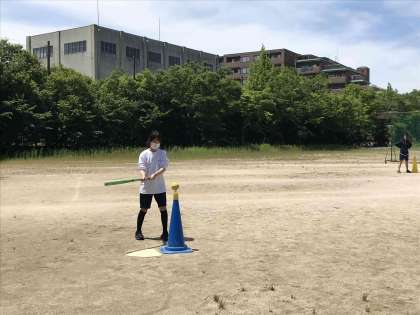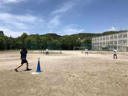 2年生の体育はソフトボールです。精一杯の力を込めて、バッティングに取り組んでいました。