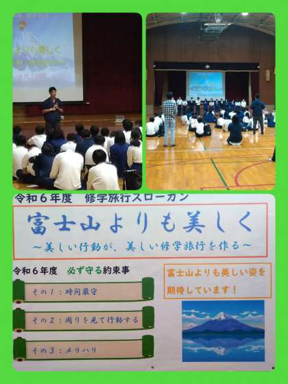 3年生 明日からの修学旅行に向けて、学年集会が行われました。実行委員からの挨拶、先生からの諸注意が行われました。しっかり準備をして明日からの修学旅行を迎えましょう!