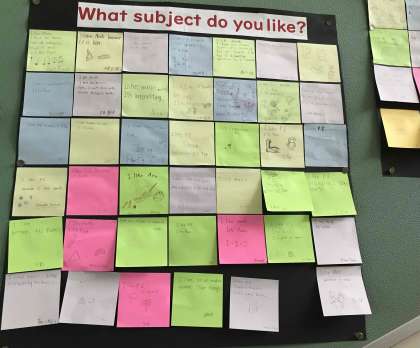 階段の掲示物が充実しています。英語の授業で記入した『付箋メッセージ』では、いろいろな内容について自分の思いを表現しています。100文字作文の取り組みの一つで、意義深いものとなっていますね。