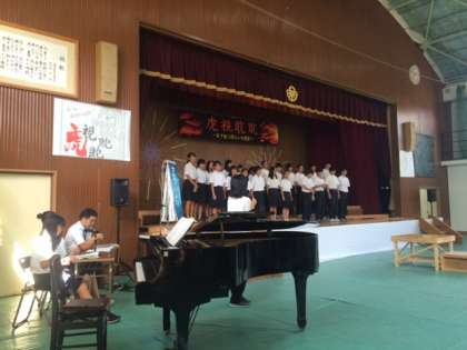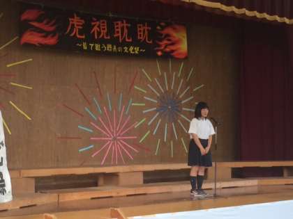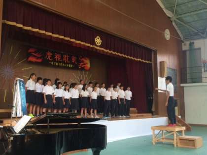 体育館では、開会のセレモニーの後、今年度結成された「合唱隊」による発表を行いました。校歌や新しい風は全員で歌いました。地元の醍醐西小学校6年生が参観しました。後半や池田小学校6年生が参観しました。池田東小学校は明日参観してくれます。