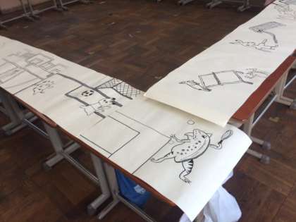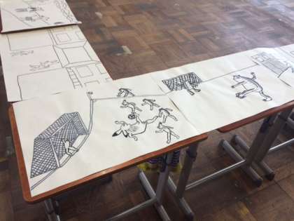 2年生は鳥獣戯画の作風で、自分の身近な生活を描きました。各学級ごとに展示されました。