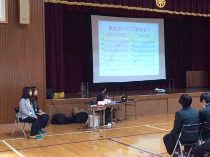 2月5日(月)6限、体育館にて1年生の性教育を実施しました。醍醐支所のご協力で講師でお招きしたのは、地元で助産院をされている助産師さんです。自分の心身の成長について、異性の人や様々な人と関わるうえで、大切なことを学ぶことができました。