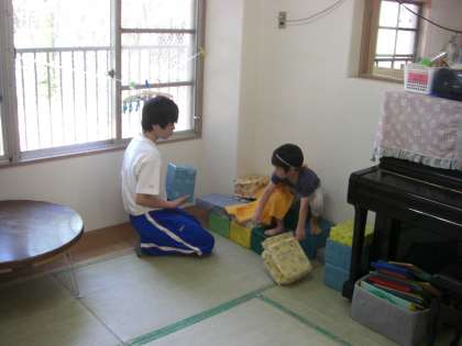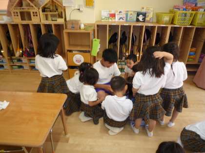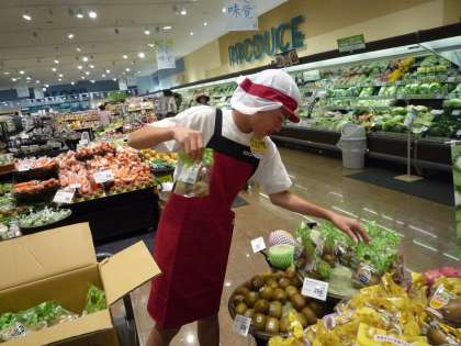 保育園にも体験させていただきました。子ども達がたくさん集まってきて人気者です。スーパーはとても忙しそうでした。