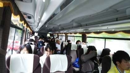 ペンションを出発しました。バスの風景です。少々お疲れですね!今日は伊豆急伊豆高原駅から電車で品川まで乗車します。それからバスで東京ディズニーランドへ向かいます。楽しみです。