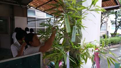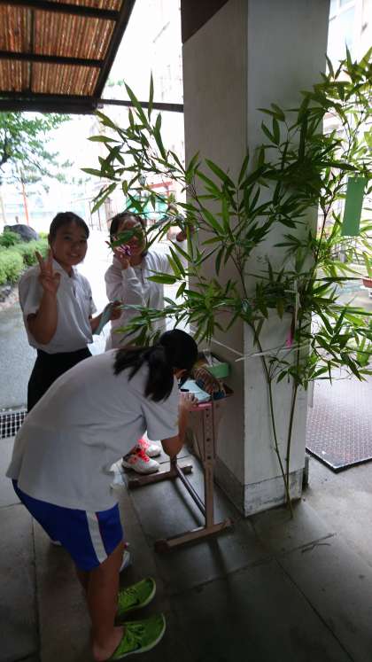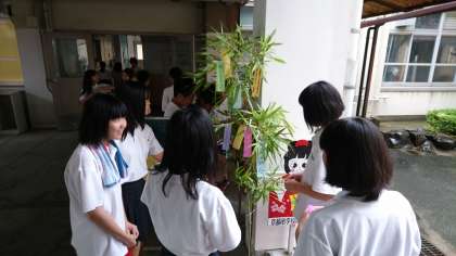 昨日、七夕にちなみ校内に笹をとりつけ短冊をおいておきました。通りがかった生徒が次々と願い事を書きささにつけ、用意した短冊があっという間になくなりました。願い事を書く姿、笹にくくりつける姿、飾られた短冊を見る表情、どれもほほえましい光景でした。天の川を見るのは難しそうですが、願い事がかなうといいですね。そして、降雨がいち早く止むことを皆さんと願いたいと思います。笹をいただいた池田小学校の先生方ありがとうございました。