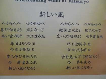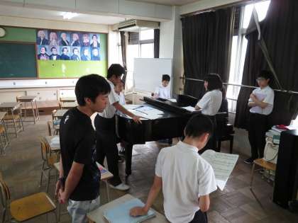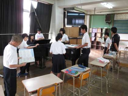 音楽室では1組が音楽の授業で、ピアノを囲んでうたっているところでした。栗陵中には1996年に生徒会作詞・作曲の生徒会歌「新しい風」がありますが、まだ一度も聞いたことがないのでリクエストしました。1番だけでしたがうたいやすいメロディーで素晴らしい歌詞です。一度聴いただけで気に入りました。終業式で全校生徒で歌うこともお願いしたので楽しみです。「新しい風」そして温かい風を人から人へ、心から心へ笑顔と一緒に広めましょう。1組のみなさんありがとうございました。