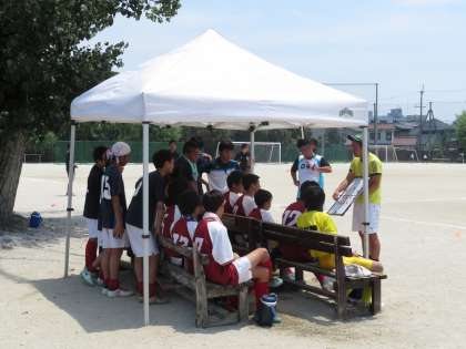 3日連続グランドは40度を越える猛暑で、体力が消耗して満身創痍で迎えた3回戦は太秦中と対戦しました。開始早々から何度もシュートを打たれ粘りましたが、次々とシュートを決められ残念ながら敗れました。