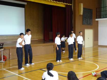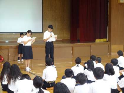 8月24日(金)始業式終了後、体育館で1年生の学年集会が行われました。代表委員進行のもと、各クラスの1学期の振り返りや2学期の抱負、そして、クラスごとに「友達思いな人」「ノートをきれいに書けている人」の発表もありました。その後、先生方からの話もありましたが、真剣に聞いていました。